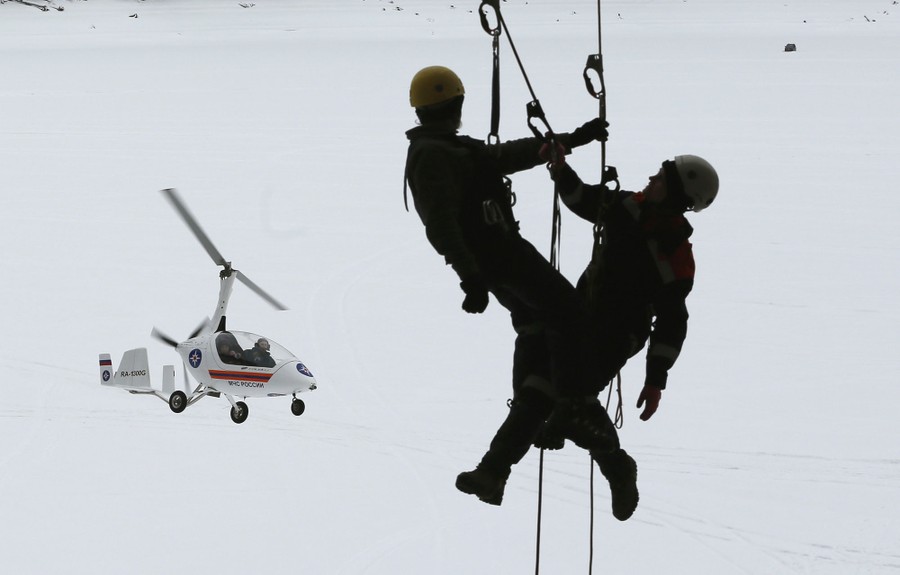 Read moreRescuers Yulia Borisova (right) and Alexander Savinich, members of the "Spasatel" (Rescuer) state regional search and rescue service group, attend a training session dedicated to evacuation under the conditions of rock climbing, with a "Calidus" gyrocopter of the Russian Emergencies' Ministry seen in the background, on the bank of the frozen Biryusa Bay of Yenisei River near Krasnoyarsk, Siberia, on March 3, 2015. #