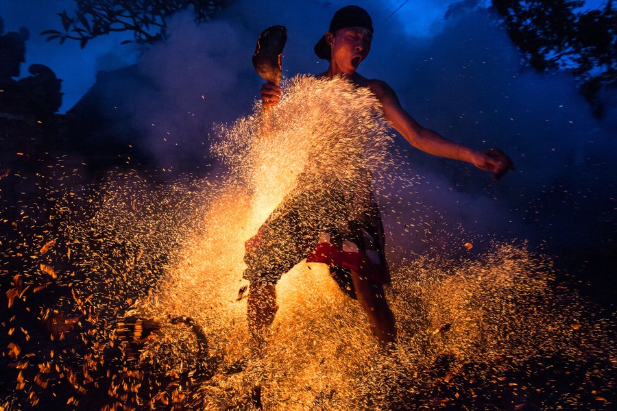 Read moreA Balinese man kicks up the fire during the "Mesabatan Api" ritual ahead of Nyepi Day on March 20, 2015, in Gianyar, Bali, Indonesia. Mesabatan Api is held annually a day before the Nyepi Day of Silence, as it symbolizes the purification of universe and human body through fire. Nyepi is a Hindu celebration observed every New Year according to the Balinese calendar. The national holiday is one of self-reflection and meditation and activities such as working, watching television, or traveling are restricted between the hours of 6 a.m. and 6 p.m. #