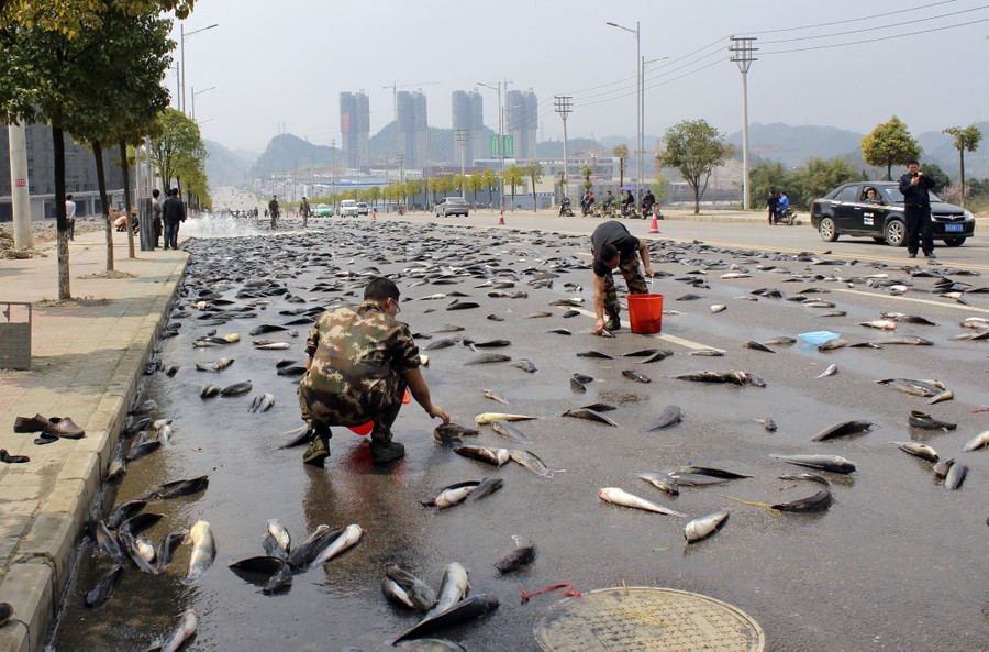 Read morePeople pick up catfish that fell from a truck on a street in Kaili, Guizhou province, China, on March 18, 2015. The door of the truck carrying 6800 kilograms (14,991 pounds) of catfish was opened by accident as it traveled along a street in Kaili on Wednesday. With the help of local firefighters and residents, most of the fish were cleared up in about two hours, local media reported. #