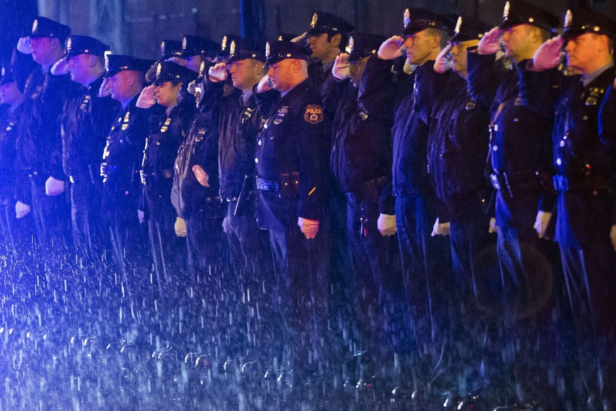 Read moreLaw-enforcement officers salute the arrival of the remains of the Philadelphia police officer Robert Wilson III before a funeral procession on March 14, 2015, in Philadelphia. City officials said on March 5, 2015, Wilson was shot and killed after he and his partner exchanged gunfire with two suspects trying to rob a video-game store. #