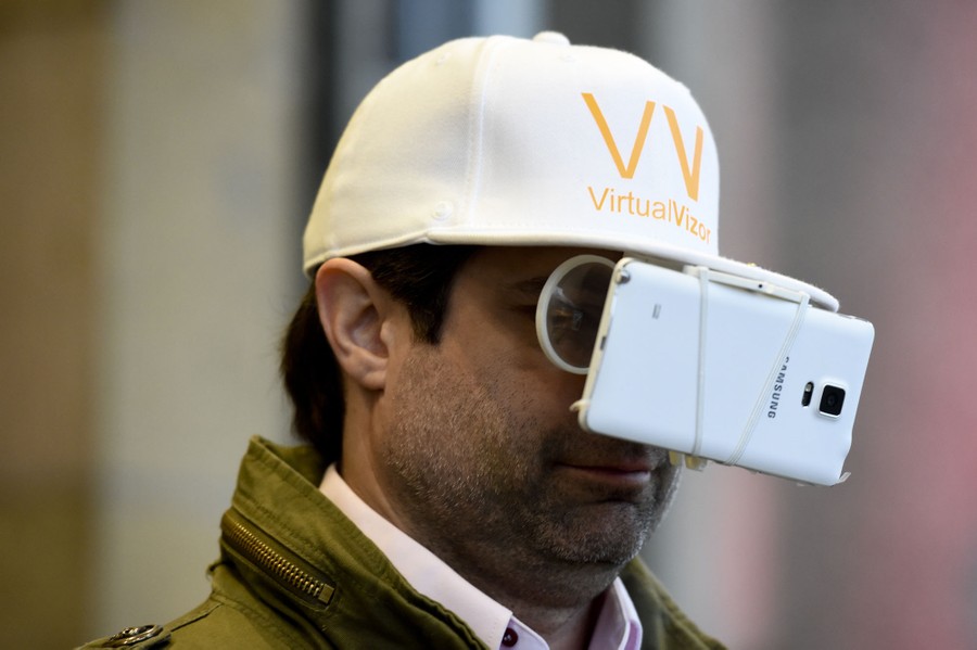 Read moreA man uses his Samsung smartphone attached to a hat before the official opening of the CeBIT trade fair in Hanover on March 15, 2015. The world's biggest computer and software fair was open to the public from March 16 to 20. #