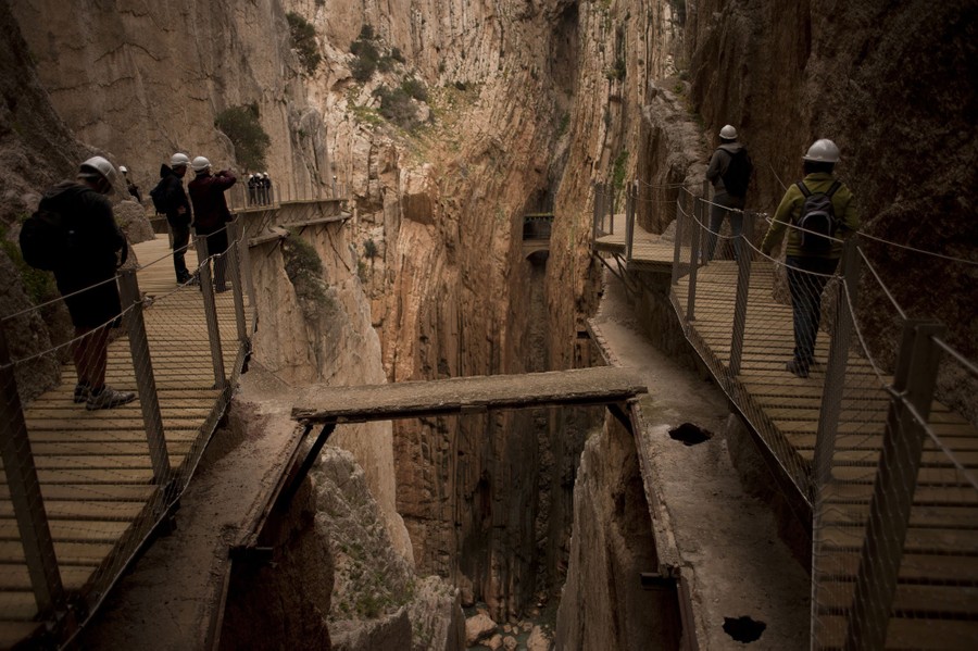 Read moreJournalists and visitors walk during a visit to the foot-path "El Caminito del Rey" (King's little path), a narrow walkway hanging and carved on the steep walls of a defile in Ardales near Malaga, Spain, on March 15, 2015. The one-meter wide and 7.7-kilometer long path, hanging from Ardales' defile at 100 meters high, was closed in the mid '90s after several hikers died while walking it. Once restored, it will be reopened to the public on March 28, 2015. #