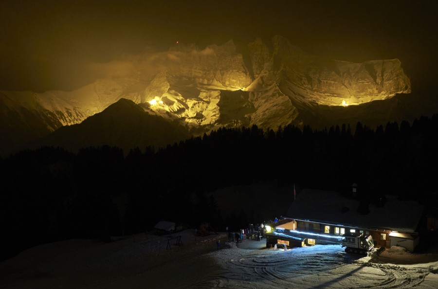 Read morePeople watch the three summits of the Dents-du-Midi mountain, Cime de l'Est, La Cathedrale and the Haute Cime (left to right), being artificially lit during the 13 Summits event in Champoussin outside a restaurant near Val d'Illiez on March 18, 2015. Sixty mountain guides used 217 kilograms (478 pounds) of pyrotechnic devices to light up all 13 summits spread around the county during the three minutes of the event. 13 Summits is a project to celebrate the 200th anniversary of the entry of the County of Valais into the Swiss Confederation. #