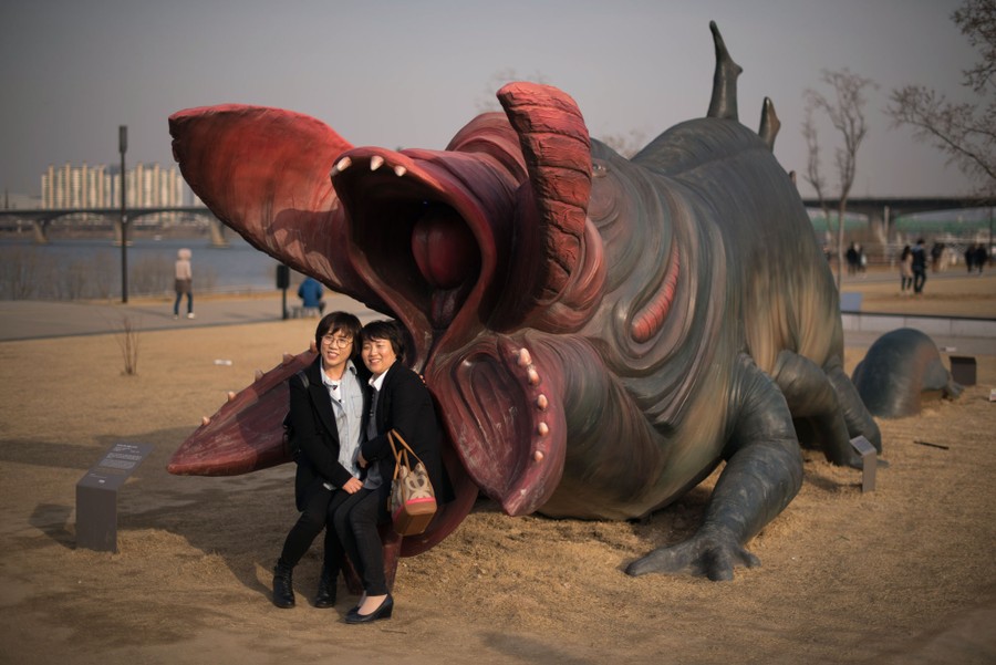 Read moreTwo women pose with a statue of a monster at Yeouido Park in Seoul, South Korea, on March 15, 2015. The statue is a representation of the creature from the 2006 South Korean movie The Host. #