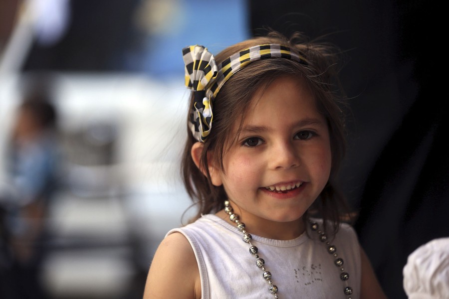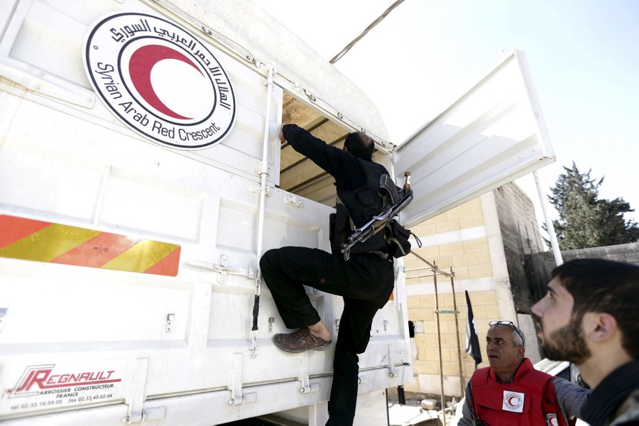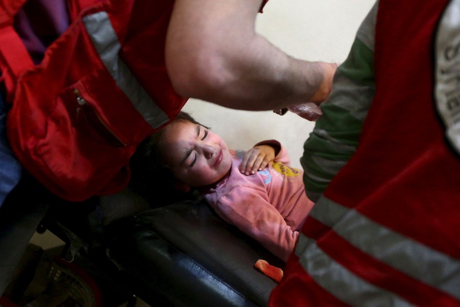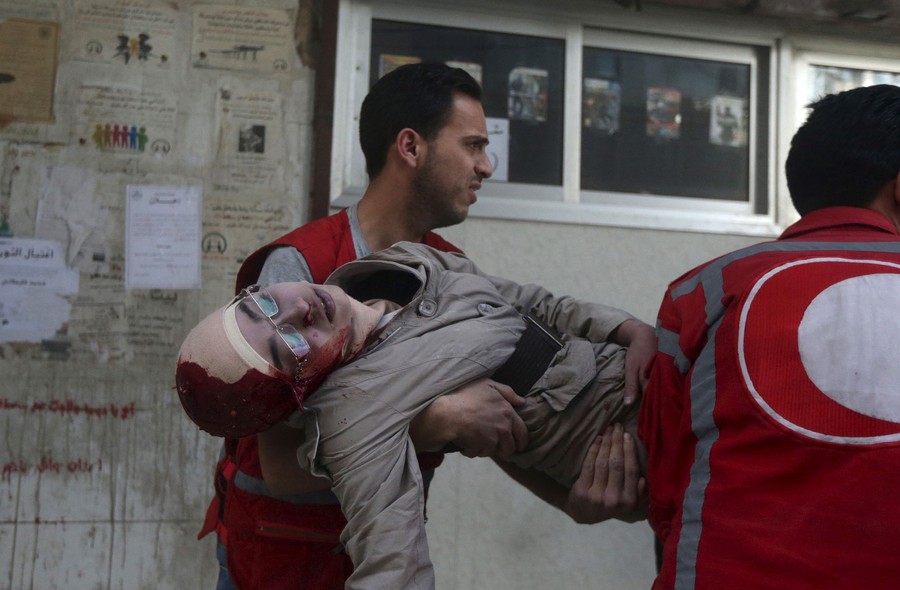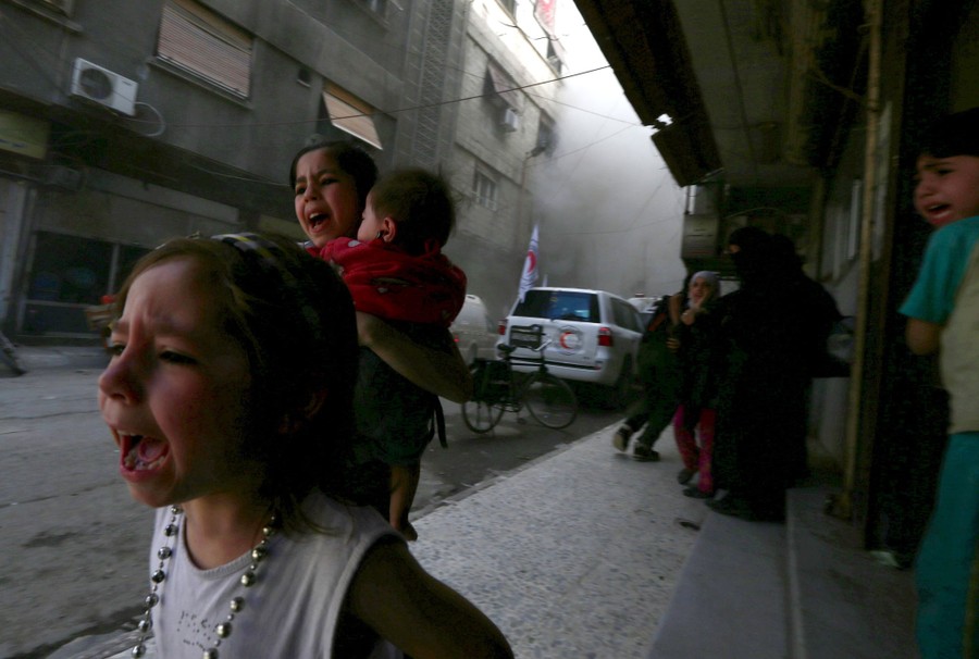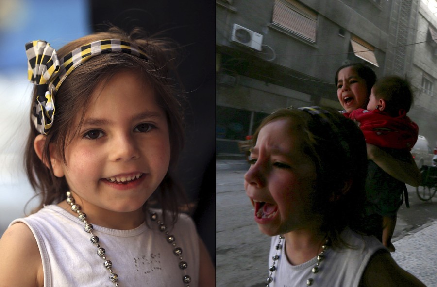 On May 6, Reuters photographer Bassam Khabieh was in the Douma neighborhood of Damascus, Syria, covering the arrival of a Red Crescent convoy carrying medical aid and supplies used for activities to give psychological support to children affected by the war. Khabieh: "Whenever the aid convoy entered the Eastern Ghouta, children would gather around it, happy that they were going to be supplied with food and medicine. While I was there, the children asked me to take their pictures so they could see them on the camera's screen. The children gathered around me so I could photograph them. First I took a photo of Ghazal, then her sister Judy who was carrying a baby called Suhair asked me to take a picture of her kissing the baby. While I was taking these photos, a shell landed on the area. The children started to scream and cry amid the dust and blood around them. The shell killed a female volunteer from the Red Crescent. The children were terrified, especially when they saw the female volunteer covered with blood. This was the first time I had seen how children's innocent laughter could turn into screams, fear and tears. Seconds before the strike, the children were looking at me happily, getting ready for a picture. It was a very sad moment when I put my eye to the viewfinder to take pictures of laughing children; then when I looked back after taking the picture, I saw the same children crying, distraught."