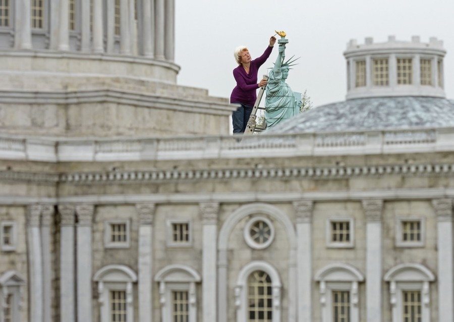 Read moreModel maker Helga Mueller restores the model of the Statue of Liberty with gold foil behind a model of the Capitol of Washington in the landscape park Miniwelt (Miniworld) in Lichtenstein, Germany, on May 20, 2015. Miniwelt presents about 100 detailed replica buildings at a 1:25 scale. #