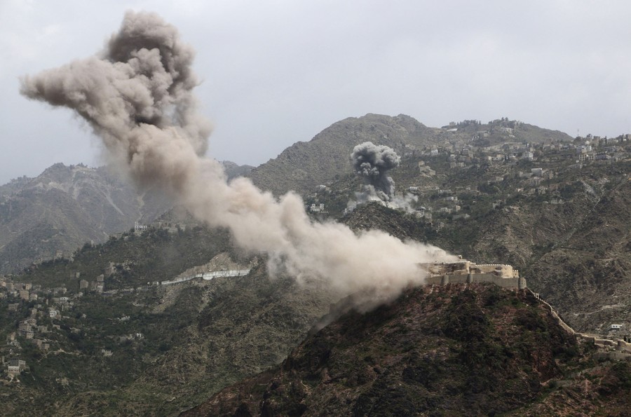 Read moreSmoke rises from al-Qahira castle, an ancient fortress that was recently taken over by Shiite rebels, and another building on the Saber mountain, in the background, following Saudi-led airstrikes in Taiz city, Yemen, on May 21, 2015. Peace talks on Yemen will begin next week in Geneva, the U.N. announced Wednesday, as the international community tries to end weeks of Saudi-led airstrikes against an Iran-supported rebel group and a growing humanitarian crisis that has left millions short of food and fuel. #