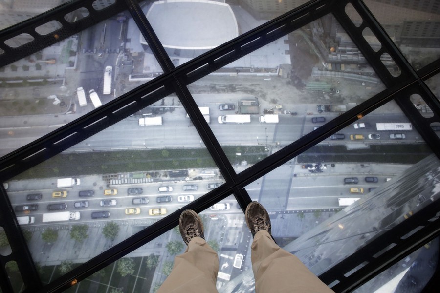 Read moreA view through the Sky Portal shows a live video view of the streets below from One World Observatory in New York, on May 20, 2015. Visitors can stand on a round video platform that shows an actual livestream of the view straight down. The observatory atop the 104-story One World Trade Center opens to the public on May 29. #