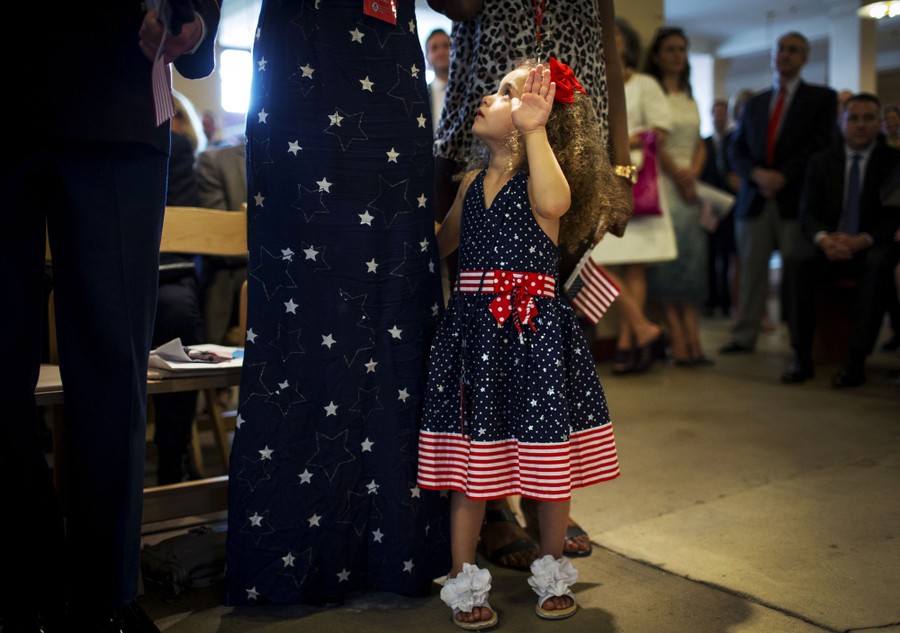 Read moreThree-year-old Mia Gudovich holds up her left hand as she looks up at her mother Iris Gudovich, originally from Israel, as Iris takes the Oath of Allegiance to become a United States citizen during a naturalization ceremony, at the Ellis Island National Museum of Immigration in New York Harbor, on May 19, 2015. 10 new U.S. citizens from eight countries took the oath of Allegiance at the special ceremony to celebrate a new exhibit at the Ellis Island National Museum of Immigration called "The Peopling of America". #