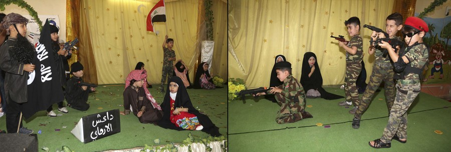 Read moreA combination of two photographs shows Iraqi students acting out a scene in a play titled "We are all against terrorism," at a government primary school in Baghdad, Iraq, on May 19, 2015. At left, students wearing beards, displaying an Islamic State flag and brandishing guns as they play the role of militants from ISIS, while at right, other children play the roles of government forces. The sign in Arabic on the stage reads, "Daesh, the terrorists," using an Arabic acronym for the Islamic State group. #