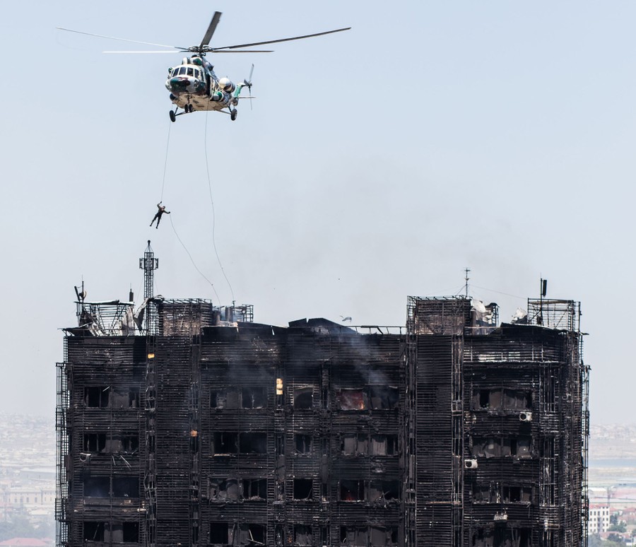 Read moreA rescue worker is lowered to the roof of an apartment building after a fire in Baku, Azerbaijan, on May 19, 2015. Azerbaijani officials say 16 people died and more than 50 were injured in the fire. Azerbaijan's chief prosecutor, Zakir Garalov, said the bad quality of plastic paneling covering the building contributed to the fire and a criminal probe has been launched to determine the culprits. #