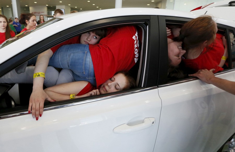 Read moreStudents from the Siberian State Technological University team squeeze into a car during a local competition and attempt for a Guinness Book of World Records for the most number of people in a car in Krasnoyarsk, Russia, on May 16. 2015. The three best teams from Krasnoyarsk took part in the final competition and surpassed the existing record of 40 persons, according to organizers. #