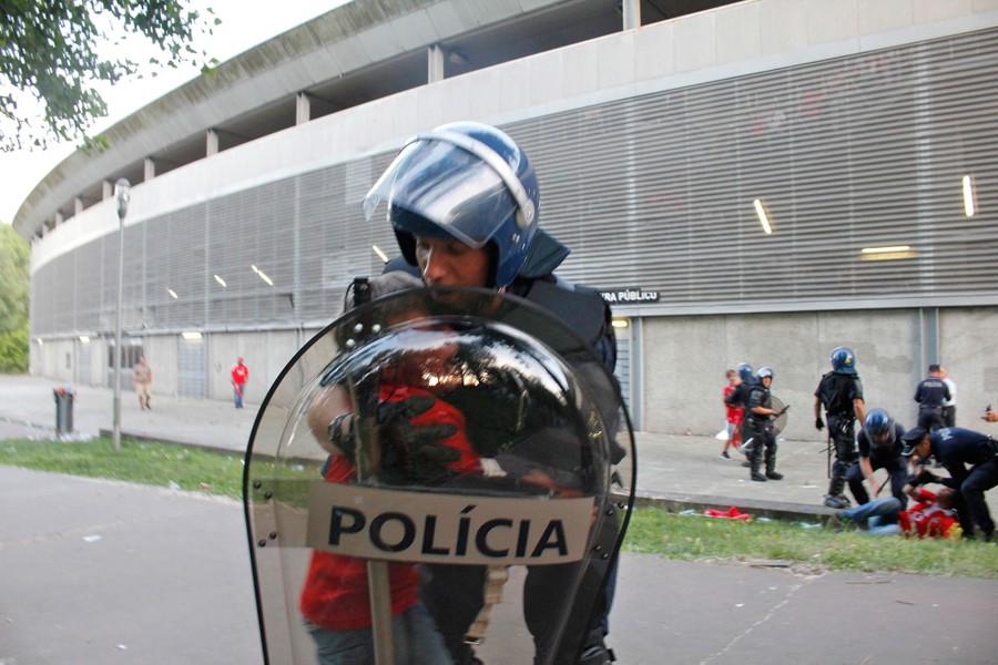 Read moreA riot policeman holds a crying boy as his father is attacked by other policemen with batons (right), outside of a stadium in Guimaraes, Portugal, on May 17, 2015. Portuguese prosecutors are investigating a policeman who beat a man in front of his young children and punched their grandfather outside the stadium, sparking a national scandal. Police approached Jose Magalhaes, his two sons and his father Sunday outside Guimaraes stadium, where Benfica had just won the Portuguese league title, according to film footage and witness reports. #