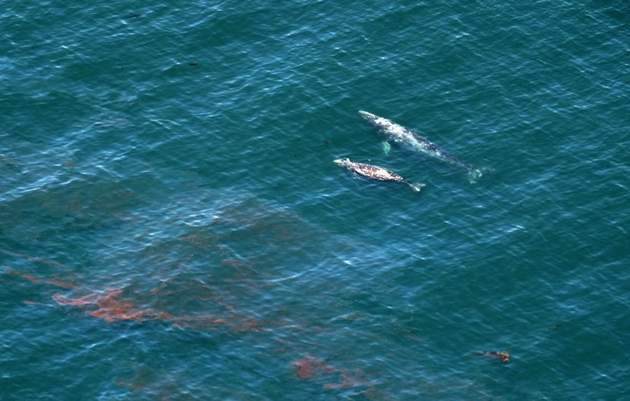Read moreWhales along the surface near a sheen of oil north of Goleta, California, on May 20, 2015. A broken onshore pipeline spewed oil down a storm drain and into the ocean for several hours Tuesday before it was shut off. #