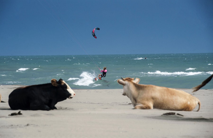Read moreA kite surfer sails on a downwind run on the waves of the Mediterranean Sea as the cows rest on the shore near the town of Ulcinj, Montenegro, on May 19, 2015. #