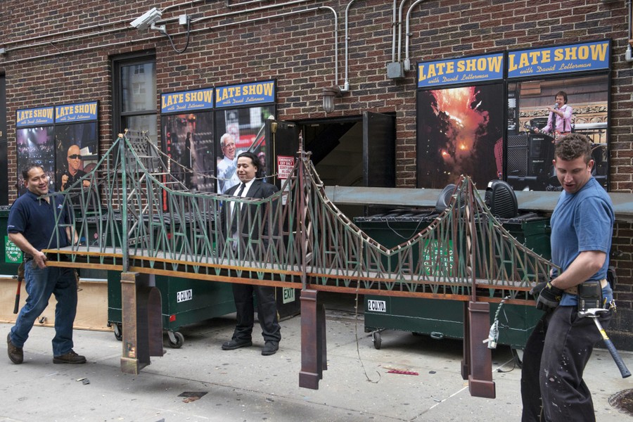 Read moreStagehands carry dismantled set pieces from the "Late Show" with David Letterman stage outside of the Ed Sullivan Theater in Manhattan, New York, on May 21, 2015, after the taping of his final show. #
