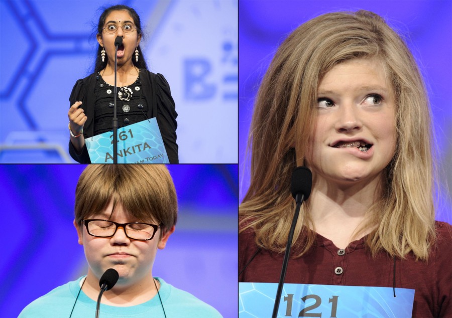 Read moreTop left: Ankita Vadiala of Manassas, Virginia, reacts to the word "ballabile", which she spelled correctly, during the semi-final round of the 88th annual Scripps National Spelling Bee at National Harbor, Maryland, on May 28, 2015. Lower left: Sean Fogerty of Tokyo, Japan, misses “sortition” in the third round of the National Spelling Bee on May 27, 2015. Right: Hailey Hogenson, of Ludington, Michigan, reacts to misspelling the word "intussusception" during the National Spelling Bee on May 27, 2015. #