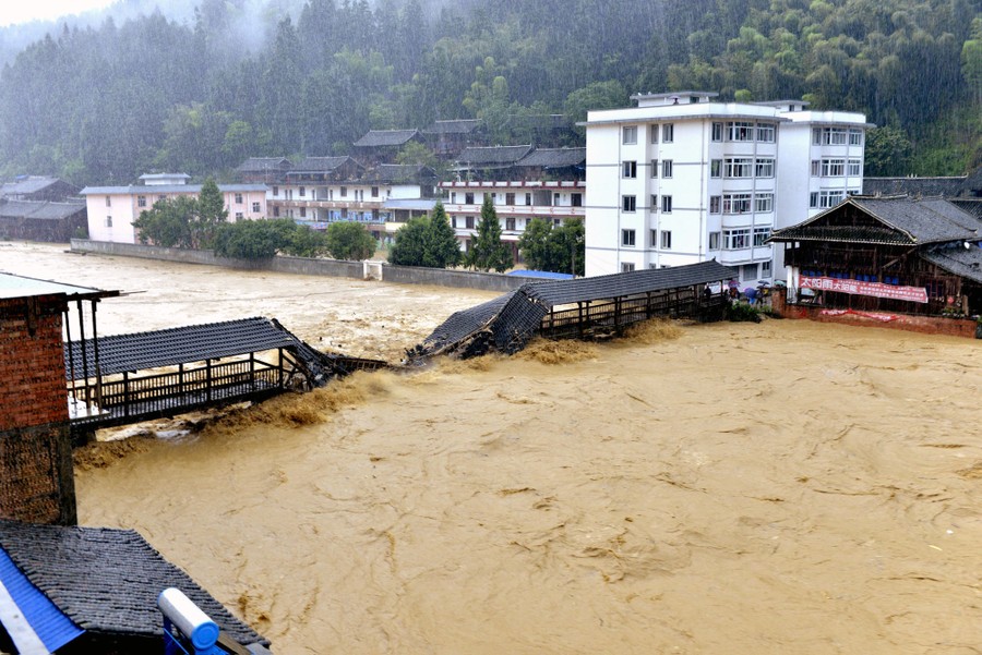 Read moreA bridge is destroyed by rushing water of an overflowing river after heavy rainfall hit Leishan county, Guizhou province, China, on May 27, 2015. Leishan county lost power and water supplies after torrential rain battered the area on Tuesday and Wednesday, Xinhua News Agency reported. #
