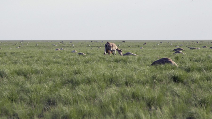 Read moreA Saiga antelope with a baby grazes next to dozens of carcasses of dead antelopes lying in a field in the Zholoba area of the Kostanay region of Kazakhstan, on May 20, 2015. About 20,000 endangered Saiga antelopes, killed by a suspected pasteurellosis infection, were found dead in Kazakhstan in a week, local media reported. #