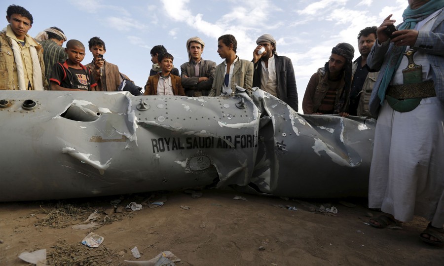 Read morePeople stand by part of a Saudi fighter jet found in Bani Harith district north of Yemen's capital Sanaa on May 24, 2015. Local media said that the Houthi rebels brought down a Saudi F-16 fighter jet north of Sanaa early on Sunday. #