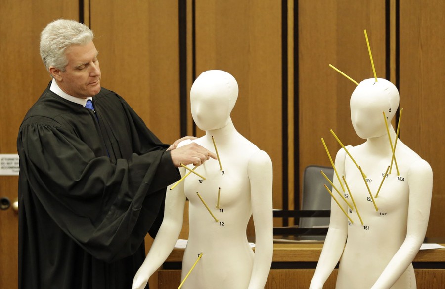 Read moreCounty Common Pleas Court Judge John O'Donnell points to mannequins marked with the gunshot wounds that two motorists suffered on May 23, 2015, in Cleveland, Ohio. Michael Brelo, a patrolman charged in the shooting deaths of two unarmed suspects during a 137-shot barrage of gunfire was acquitted Saturday in a case that helped prompt the U.S. Department of Justice determine the city police department had a history of using excessive force and violating civil rights. #