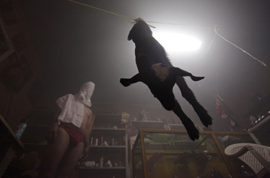 Read moreA homosexual man stands in the corner of a room as a goat hangs from a rope nearby waiting to be slaughtered by a shaman during a ritual at his sanctuary in Saltillo, Mexico, on May 22, 2015. Joaquin, a shaman who says he can cure homosexuality, offers a 20-minute ceremony in which he slaughters a black goat to pour its blood over the genitalia of the man who said wanted to be cured of homosexuality, while reading prayers for that purpose, local media reported. #
