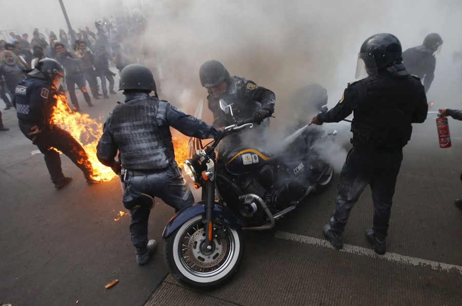 Read morePolicemen hold a motorcycle as one of their colleagues catches fire after being hit by a Molotov cocktail during a protest to mark the eight-month anniversary of the Ayotzinapa students' disappearance in Mexico City on May 26, 2015. The students' disappearance on the night of September 26, 2014 in the southwestern city of Iguala triggered massive protests in Mexico and calls for justice. Officials say they were abducted by corrupt police officers, who handed them over to a local drug gang. #