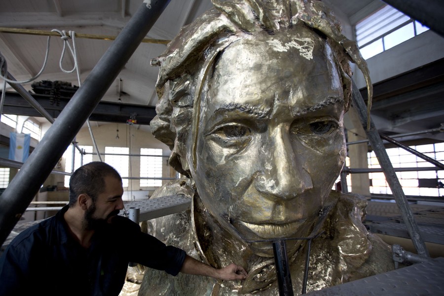 Read moreSculptor Andres Zerneri touches his bronze statue of Juana Azurduy in Buenos Aires, Argentina on May 12, 2015. The statue of Azurduy, a guerrilla military leader born in Bolivia who fought for the independence of both Argentina and Bolivia, will replace the Christopher Columbus monument located behind the government house. #