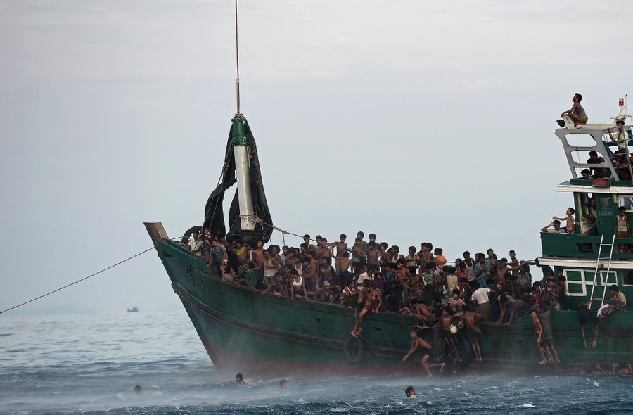 Read moreRohingya migrants jump from a boat drifting in Thai waters off the southern island of Koh Lipe in the Andaman sea, to collect food supplies dropped by a Thai army helicopter on May 14, 2015. A boat crammed with scores of Rohingya migrants -- including many young children -- was found drifting in Thai waters on May 14, with passengers saying several people had died over the last few days. #