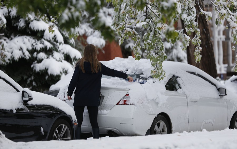 Read moreFramed by branches sagging under the weight of a wet, heavy snow, a motorist clears the windows of her vehicle before setting out on the roads on May 10, 2015, in Denver, Colorado. The spring storm wreaked havoc across the state, triggering flood warnings in northeast counties while dropping up to 18 inches of snow in the southern parts of the state. #