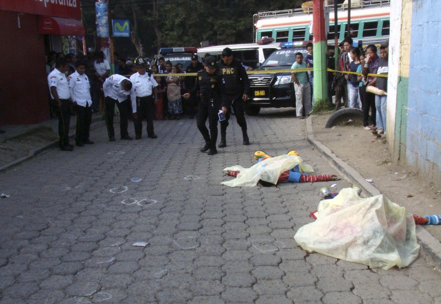 Read moreThe bodies of two men dressed as clowns lie on a street in Chimaltenango, west of Guatemala City, on May 8, 2015. The men were killed on their way to an activity in a school in the sector, with a preliminary report saying that unidentified hitmen committed the crime, according to local media. #
