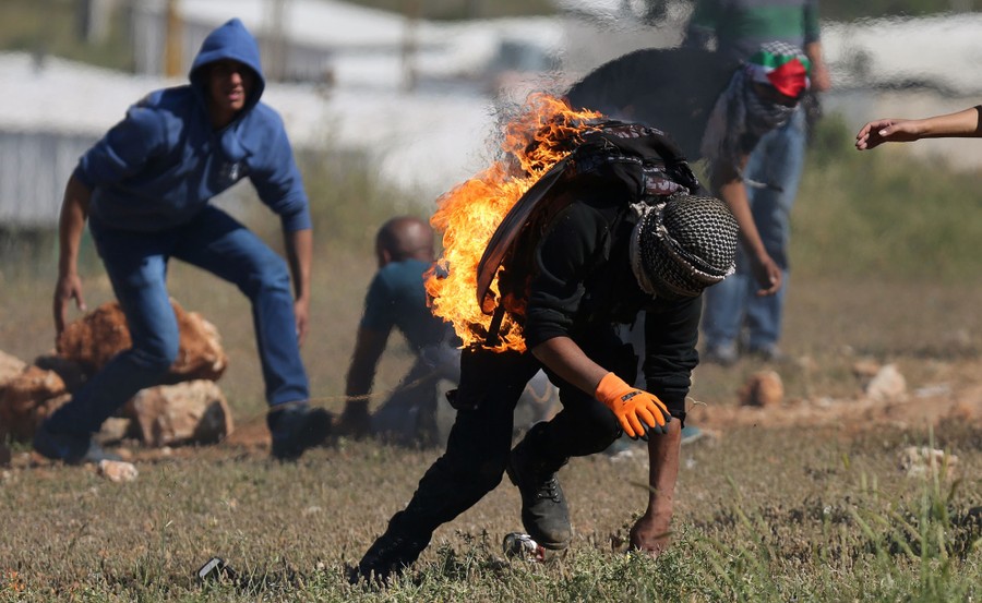 Read moreA demonstrator, who set himself on fire after misthrowing a Molotov cocktail, reacts during clashes with Israeli security forces following a demonstration to mark the 67th anniversary of the "Nakba" near the Israeli Ofer prison, in the West Bank village of Betunia on May 15, 2015. "Nakba", in Arabic, means "catastrophe", and is a reference to the birth of the state of Israel 67-years-ago in British-mandate Palestine, which led to the displacement of hundreds of thousands of Palestinians who either fled or were driven out of their homes during the 1948 war over Israel's creation. #