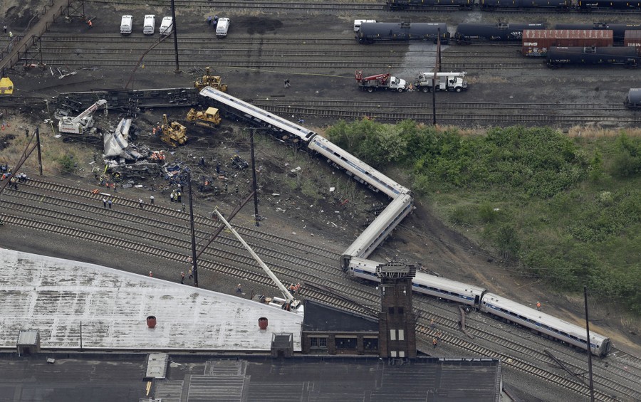 Read moreEmergency personnel work the scene of a train wreck on May 12, 2015, in Philadelphia. An Amtrak train headed to New York City derailed and crashed in Philadelphia, killing eight passengers. #