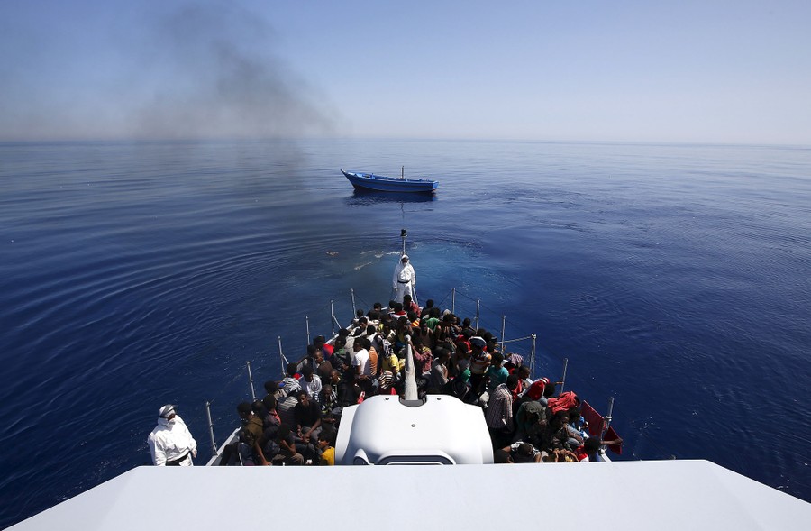 Read moreA group of 300 sub-Saharan Africans sit on board the Italian Finance Police vessel Di Bartolo as their tiny boat is left to adrift off the coast of Sicily on May 14, 2015. Around 1,100 migrants were rescued off the coast of Sicily, about 130 miles from Lampedusa, according to the police. #