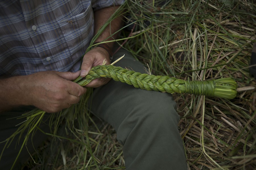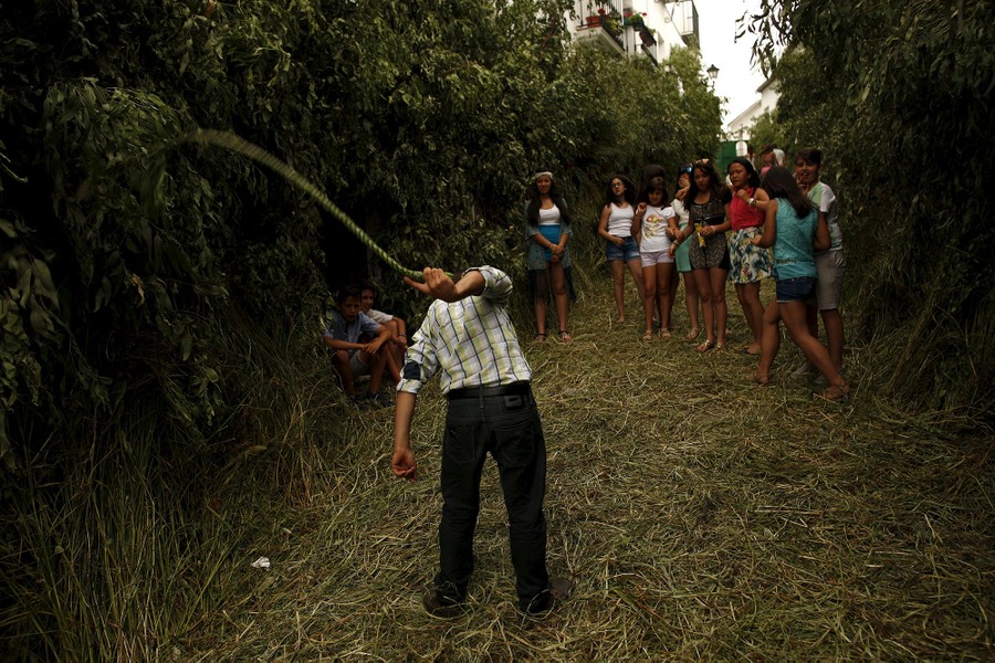 Read moreA man makes a traditional "cachiporra", a whip made with grass during the Corpus Christi celebrations in Zahara de la Sierra, Spain, on June 7, 2015. The village of Zahara de la Sierra celebrates the feast of Corpus Christi (or Body of Christ in Latin) by covering the streets and facades of houses with branches of trees and grass. #