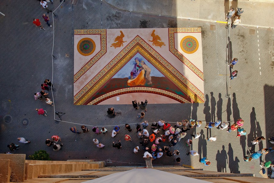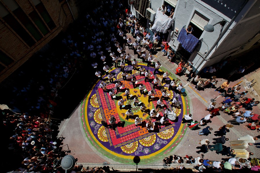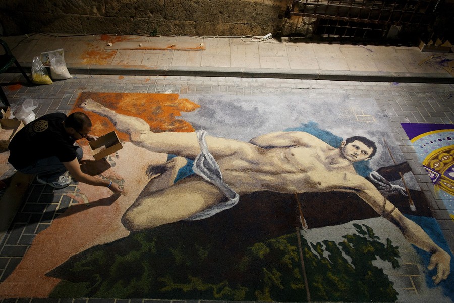 Read morePeople work on sawdust carpets (Alfombras de Serrin) in the early hours along the streets during the Corpus Christi feast on June 7, 2015, in Elche de la Sierra, near Albacete, Spain. The festival, started in 1964, was inspired by carpets of flowers from Catalonia. The sawdust carpets last until the Corpus Christi procession walks through them. #