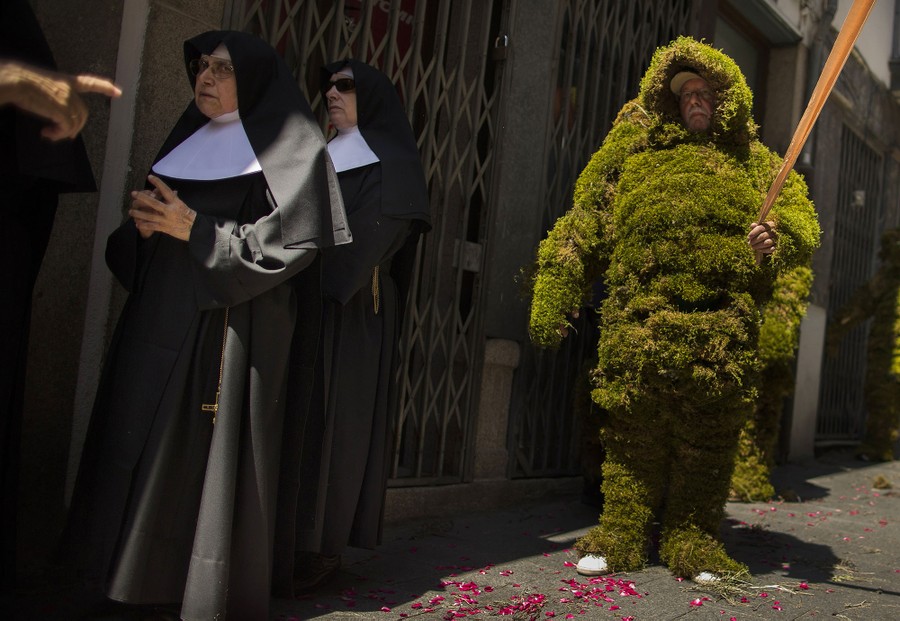 Read moreA moss man poses for a picture before the Corpus Christi procession in the small village of Bejar, Spain, on June 7, 2015. Men covered from head to toe in moss have paraded through the streets of Bejar to commemorate a daring raid that local legend says helped liberate their town from Muslim occupation some eight centuries ago. Locals believe that during the reign of King Alfonso VIII of Castile (1155-1214) men camouflaged themselves in moss from local forests to enable them to approach the gates of a Muslim fortress. #