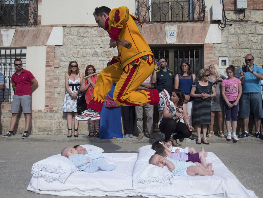 Read moreA man dressed in a red and yellow costume representing the devil, known as El Colacho, jumps over babies placed on a mattress during traditional Corpus Christi celebrations in Castrillo de Murcia, near Burgos, Spain, on June 22, 2014. The northern Spanish town has for centuries chosen to protect its young from evil spirits with the unusual ritual in which a man dressed as the devil leaps over mattresses each holding four or five babies. #