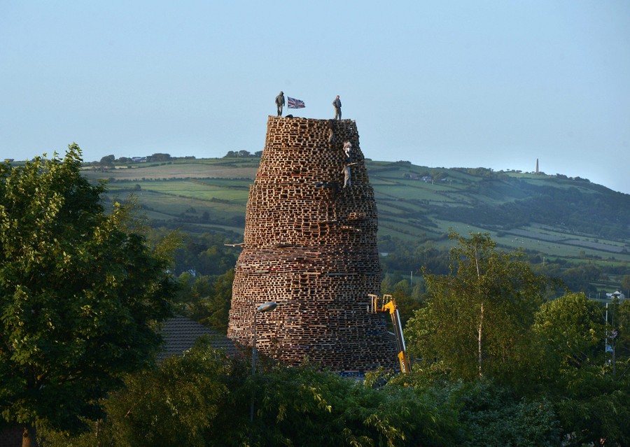 Read moreLoyalists stack pallets and tires on top of their bonfire construct in preparation for their 11th Night bonfire at the New Mossley estate on July 9, 2015, in Belfast, Northern Ireland. The New Mossley bonfire is considered by many to be the biggest in the province this year. Tradition holds that the bonfires commemorate the lighting of fires on the hills to help Williamite ships navigate through Belfast Lough at night when Protestant King William of Orange and his forces landed at Carrickfergus to fight the Catholic Jacobites, supporters of the exiled Catholic King James II. The bonfires also mark the beginning of the annual 12th of July Orange parades. The 12th of July is the most important date in the Orange calendar and marks the anniversary of King William's Battle of the Boyne victory, when Orangemen and women commemorate “The Twelfth.” #