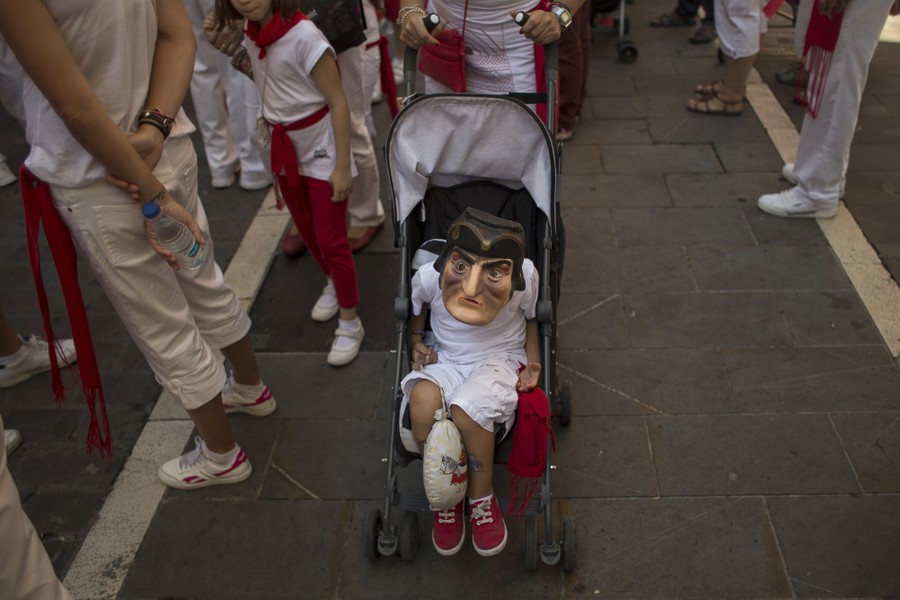 Read moreA child wears a mask of the “Vinager” cabezudo figure during the procession of cabezudos at the San Fermin festival, in Pamplona, Spain, on July 10, 2015. #