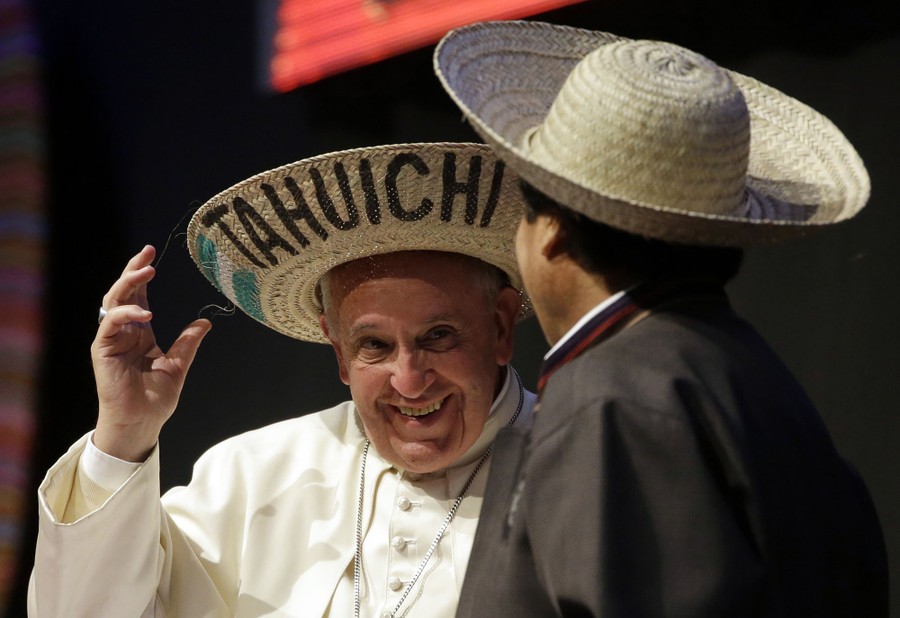 Read morePope Francis and Bolivia's President Evo Morales wear traditional Bolivian hats during the second World Meeting of Popular Movements in Santa Cruz, Bolivia, on July 9, 2015. #