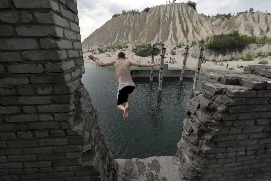 Read moreA man jumps into water from the roof of an abandoned Soviet-era prison in Rummu quarry, Estonia, during hot weather on July 4, 2015. During the Soviet era, Rummu quarry was used as a mining site for Vasalemma marble and most of the workforce came from among the detainees of Murru prison. When the prison closed after 1991, pumps that once kept the quarry and the prison dry were shut down, causing water to fill the quarry. It has become an unofficial and unguarded swimming and diving spot, attracting locals and tourists. #
