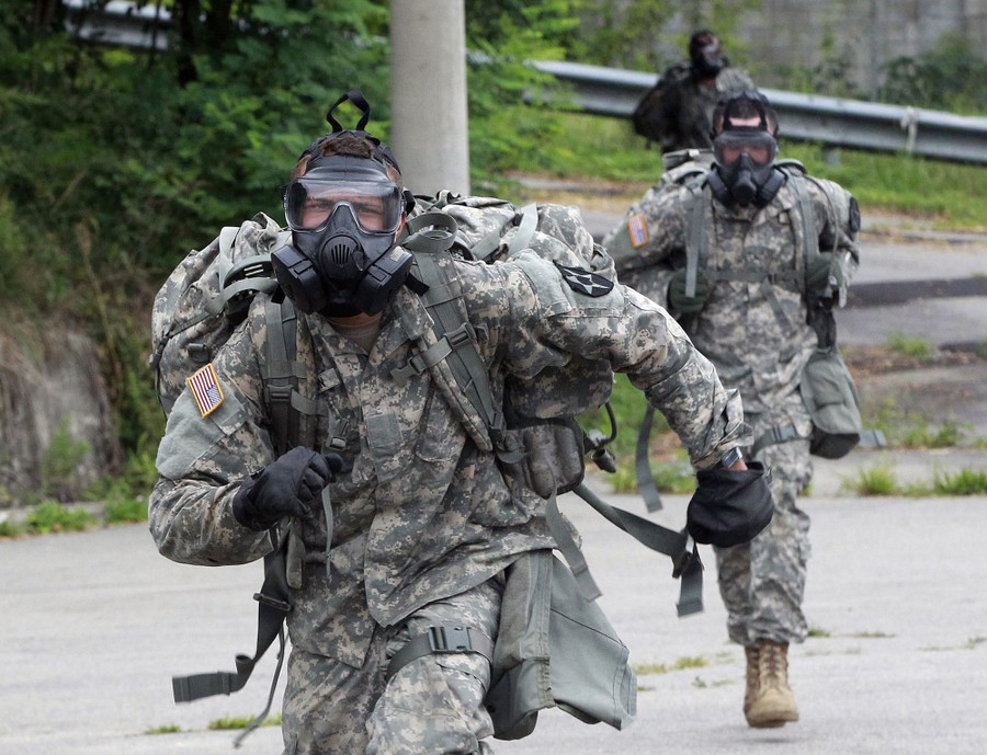 Read moreSoldiers of the U.S. Army 23rd Chemical Battalion wearing gas masks run during a competition at Camp Stanley in Uijeongbu, South Korea, on July 8, 2015. About 250 soldiers attended this competition to test individual soldier skills consisting of medical tasks, weapons assembly, and disassembly in a physically and mentally challenging environment. #