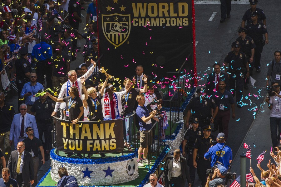 Read moreThe World-Cup-winning U.S. women's soccer team celebrates with the World Cup trophy as fans cheer during a ticker tape parade in New York City on July 10, 2015. The team rolled up New York City’s “Canyon of Heroes” on Friday, with a blizzard of confetti swirling overhead in the first ticker-tape parade honoring a women’s sports team. #