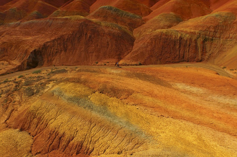 Read moreAn aerial view shows a man jogging along a road inside the Zhangye Danxia National Geological Park in Zhangye, Gansu province, China on July 5, 2015. The national geological park, covering an area of 510 square kilometers, is known for its colorful rock formations. #