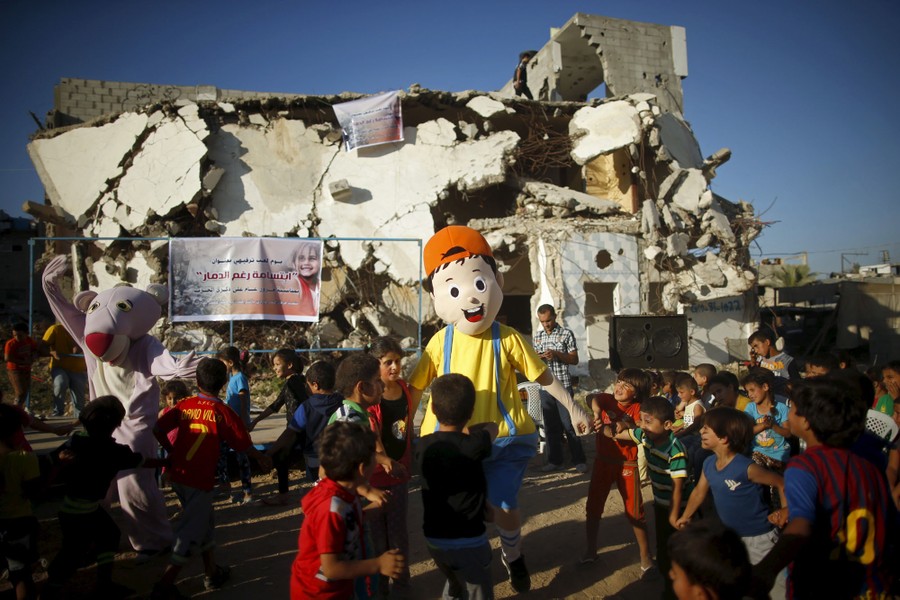 Read morePalestinians wearing costumes perform to amuse children in front of a house that witnesses said was destroyed by Israeli shelling during a 50-day war last summer in the east of Gaza City on July 8, 2015. #