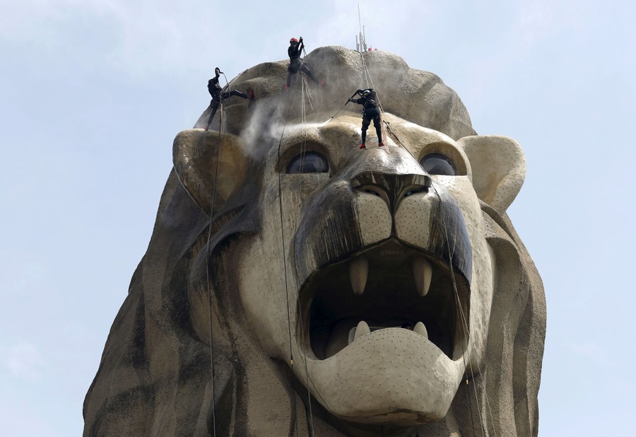 Read moreCleaners spray clean the 37-meter-tall icon of the Merlion on the resort island of Sentosa ahead of Singapore’s 50th-anniversary celebrations on July 8, 2015. The five-day-long cleaning is the mythical creature's first “bath” since its last cleaning in 2012. #