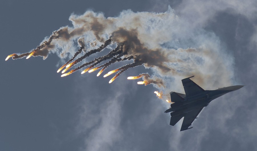 Read moreAn Su-27 jet of aerobatics team Russkiye Vityasy, or Russian Knights, performs during an air show at the International Maritime Defense show in St. Petersburg, Russia, on July 5, 2015. #