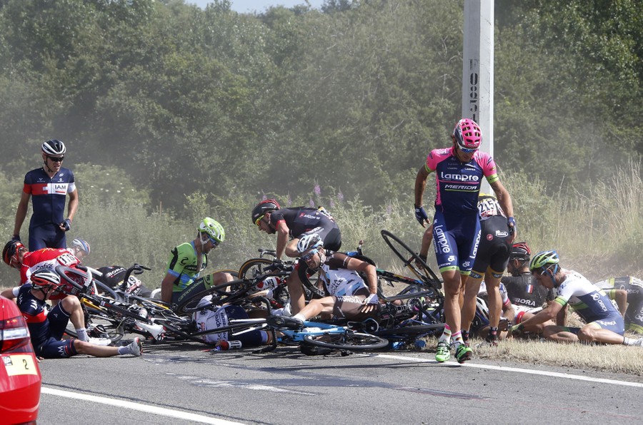 Read moreRiders and their bicycles fill the road after a fall during the 159.5-kilometer third stage of the 102nd Tour de France cycling race between Anvers and Huy, Belgium, on July 6, 2015. #
