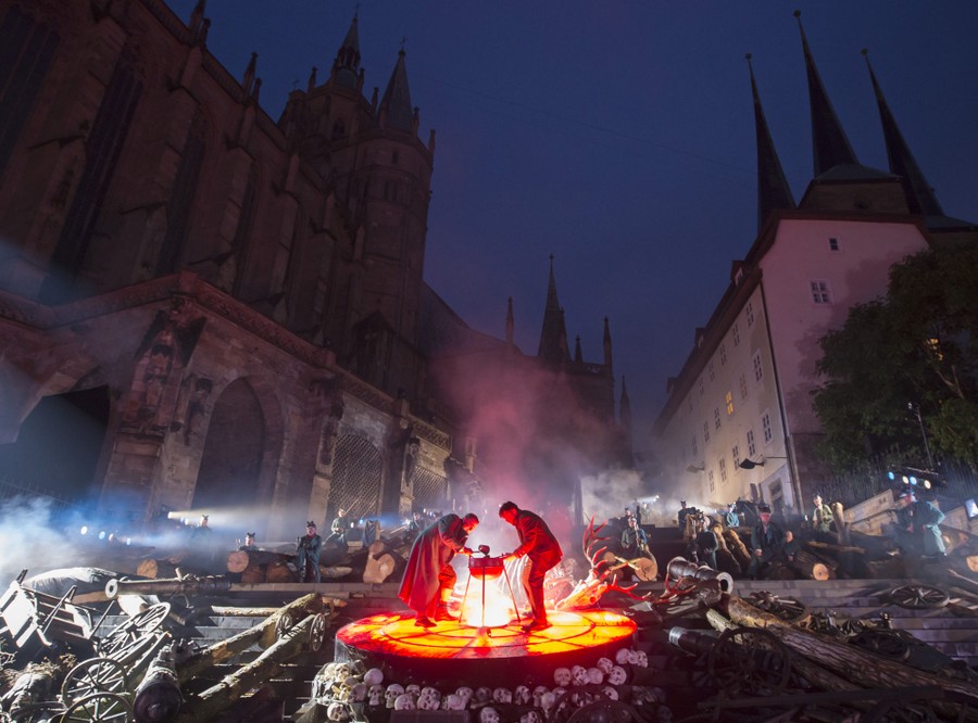 Read moreAustrian tenor Bernhard Berchthold as “Max” (left) and Russian baritone Juri Batukov as “Kaspar” play during a rehearsal of the opera “Der Freischuetz” (The Marksman) at the DomStufen open air festival in front of the Mariendom in Erfurt, Germany, on July 7, 2015. #